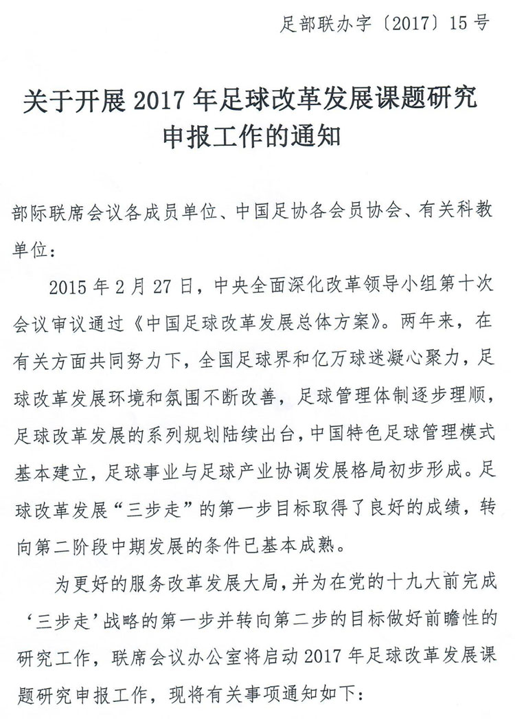 关注我们 分享 用微信扫码二维码 分享至好友和朋友圈 关于开展2017年足球改革发展课题研究申报工作的通知 2017-04-27 16:20 中国足球协会 用微信扫码二维码 分享至好友和朋友圈 附件下载:国务院足球改革发展部际联席会议办公室足球改革发展研究项目申请书 (编辑:中国足球协会) 相关新闻 中国足球协会关于进一步推进足球改革发展的若干措施 关于开展2018年足球改革发展课题研究申报工作的通知 中国足球协会关于印发《中国足球改革发展试点工作的方案》的通知