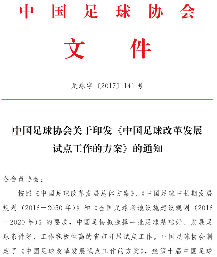 关注我们 分享 用微信扫码二维码 分享至好友和朋友圈 中国足球协会关于印发《中国足球改革发展试点工作的方案》的通知 2017-03-23 15:53 中国足球协会 用微信扫码二维码 分享至好友和朋友圈 PDF格式文件下载:关于印发《中国足球改革发展试点工作的方案》的通知 (编辑:中国足球协会) 相关新闻 中国足球协会关于进一步推进足球改革发展的若干措施 关于开展2018年足球改革发展课题研究申报工作的通知 关于开展2017年足球改革发展课题研究申报工作的通知