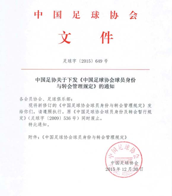 关注我们 分享 用微信扫码二维码 分享至好友和朋友圈 中国足协关于下发《中国足球协会球员身份与转会管理规定》的通知 2015-12-30 17:06 中国足球协会 用微信扫码二维码 分享至好友和朋友圈 点击下载《中国足球协会球员身份与转会管理规定》 (编辑:中国足球协会) 相关新闻 关于调整青少年球员转会与培训补偿标准管理制度的实施意见 中国足球协会青少年足球运动员骨龄参赛管理办法