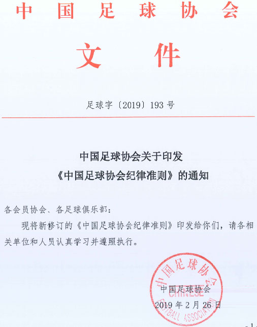 关注我们 分享 用微信扫码二维码 分享至好友和朋友圈 中国足协纪律准则(2019) 2019-02-26 15:25 中国足球协会 用微信扫码二维码 分享至好友和朋友圈 附件:《中国足球协会纪律准则》(2019版) (编辑:张素琦) 相关新闻 中国足球协会关于印发《中国足球协会纪律准则》(2024)的通知 中国足球协会关于印发《中国足球协会纪律准则》(2022)的通知 中国足球协会关于印发《中国足球协会纪律准则》(2021)的通知