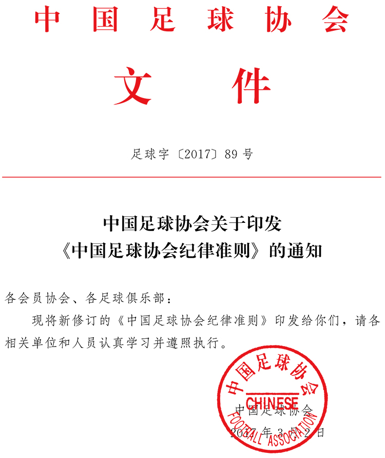 关注我们 分享 用微信扫码二维码 分享至好友和朋友圈 中国足协纪律准则(2017) 2017-03-02 17:27 中国足球协会 用微信扫码二维码 分享至好友和朋友圈 PDF附件下载:中国足球协会关于印发《中国足球协会纪律准则》的通知 (编辑:中国足球协会) 相关新闻 中国足球协会关于印发《中国足球协会纪律准则》(2024)的通知 中国足球协会关于印发《中国足球协会纪律准则》(2022)的通知 中国足球协会关于印发《中国足球协会纪律准则》(2021)的通知 中国足协纪律准则(2019)